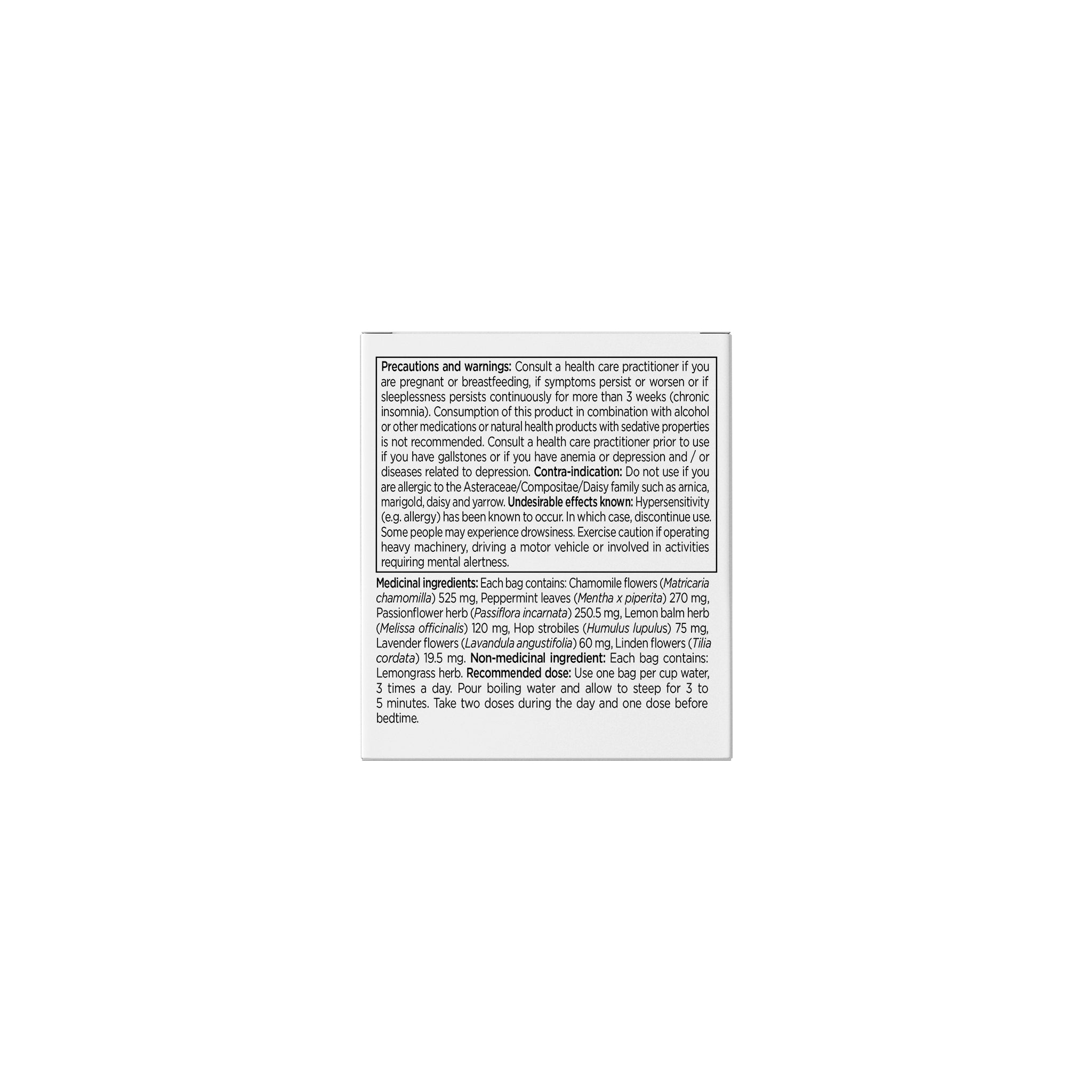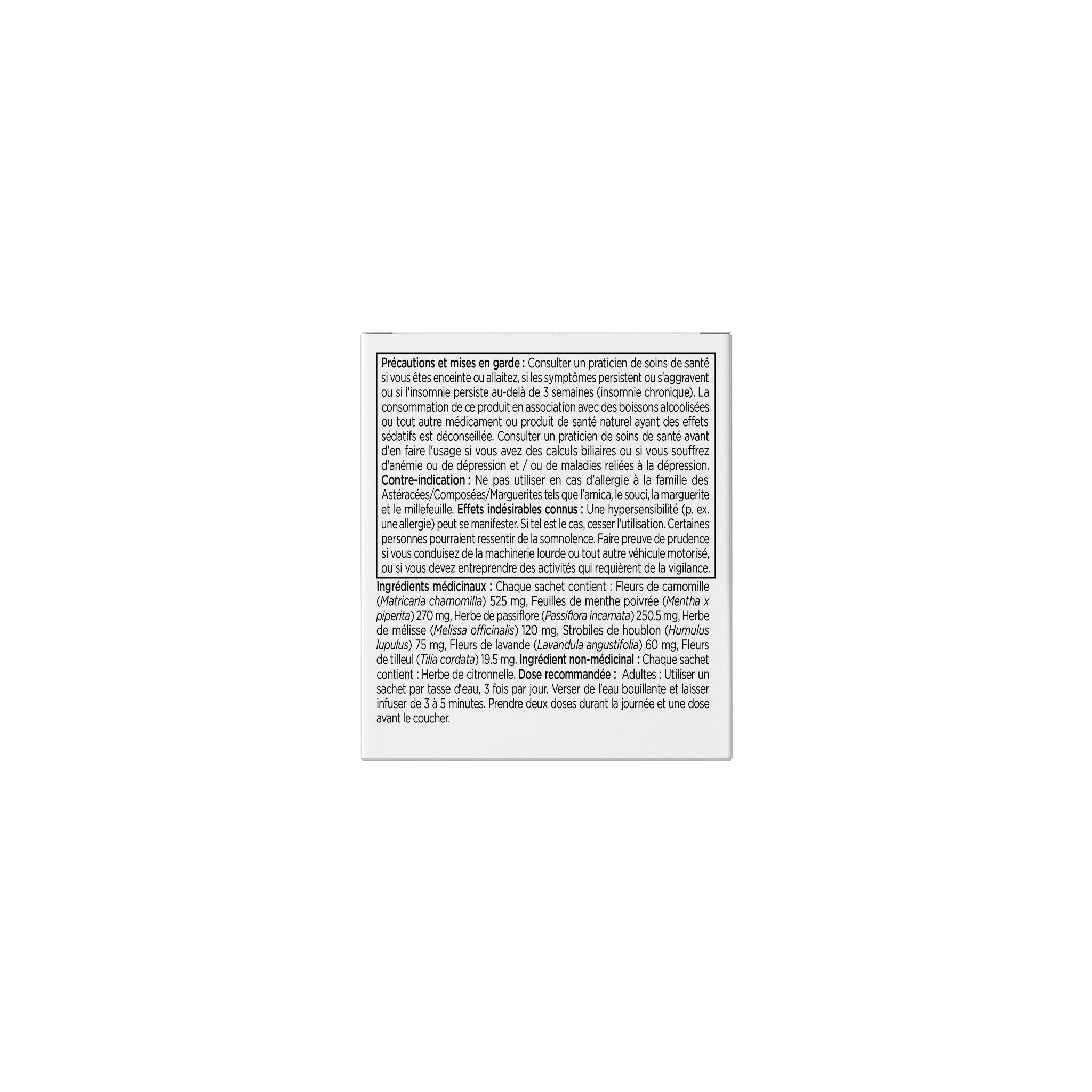 Consulter un praticien de soins de santé si vous êtes enceinte ou allaitez, si les symptômes persistent ou s'aggravent ou si l'insomnie persiste au-delà de 3 semaines (insomnie chronique). La consommation de ce produit en association avec des boissons alcoolisées ou tout autre médicament ou produit de santé naturel ayant des effets sédatifs est déconseillée. Consulter un praticien de soins de santé avant d'en faire l'usage si vous avez des calculs biliaires ou si vous souffrez d'anémie ou de dépression et / ou de maladies reliées à la dépression. Contre-indication : Ne pas utiliser en cas d'allergie à la famille des Astéracées/Composées/Marguerites tels que l’arnica, le souci, la marguerite et le millefeuille. Effets indésirables connus : Une hypersensibilité (p. ex. une allergie) peut se manifester. Si tel est le cas, cesser l'utilisation. Certaines personnes pourraient ressentir de la somnolence. Faire preuve de prudence si vous conduisez de la machinerie lourde ou tout autre véhicule motorisé, ou si vous devez entreprendre des activités qui requièrent de la vigilance.